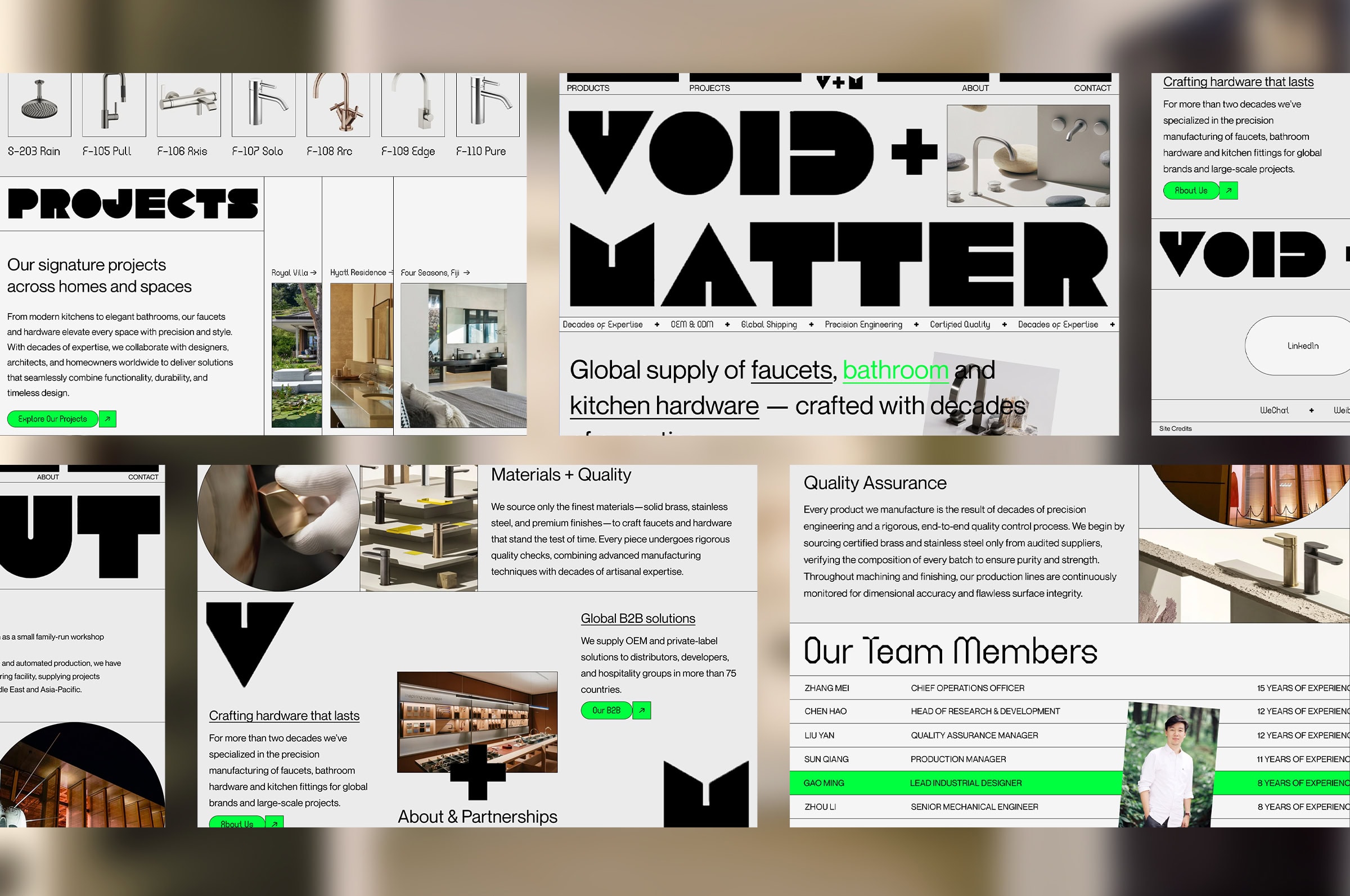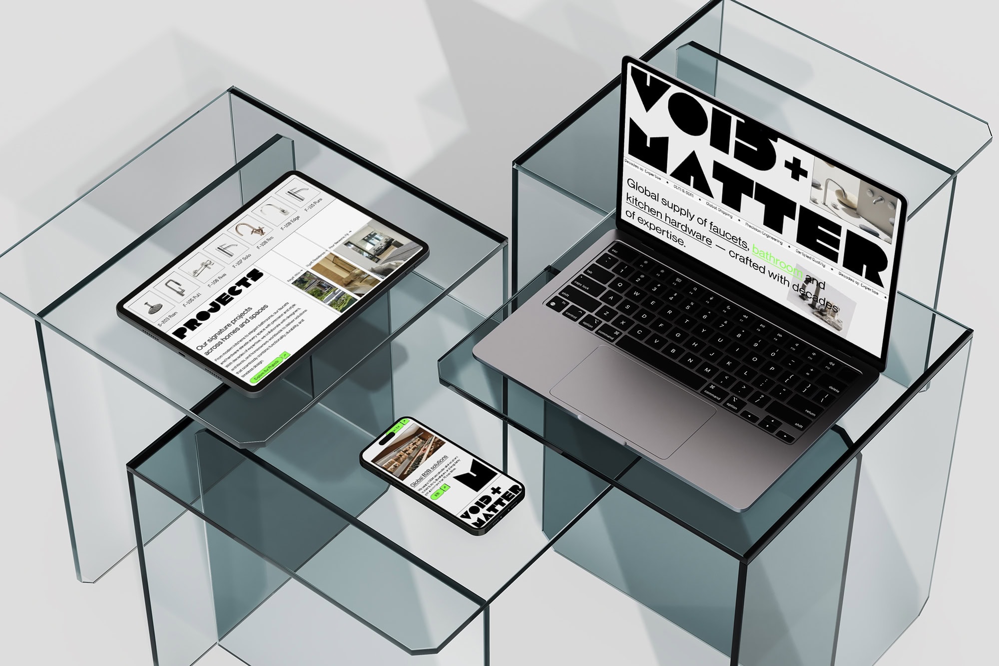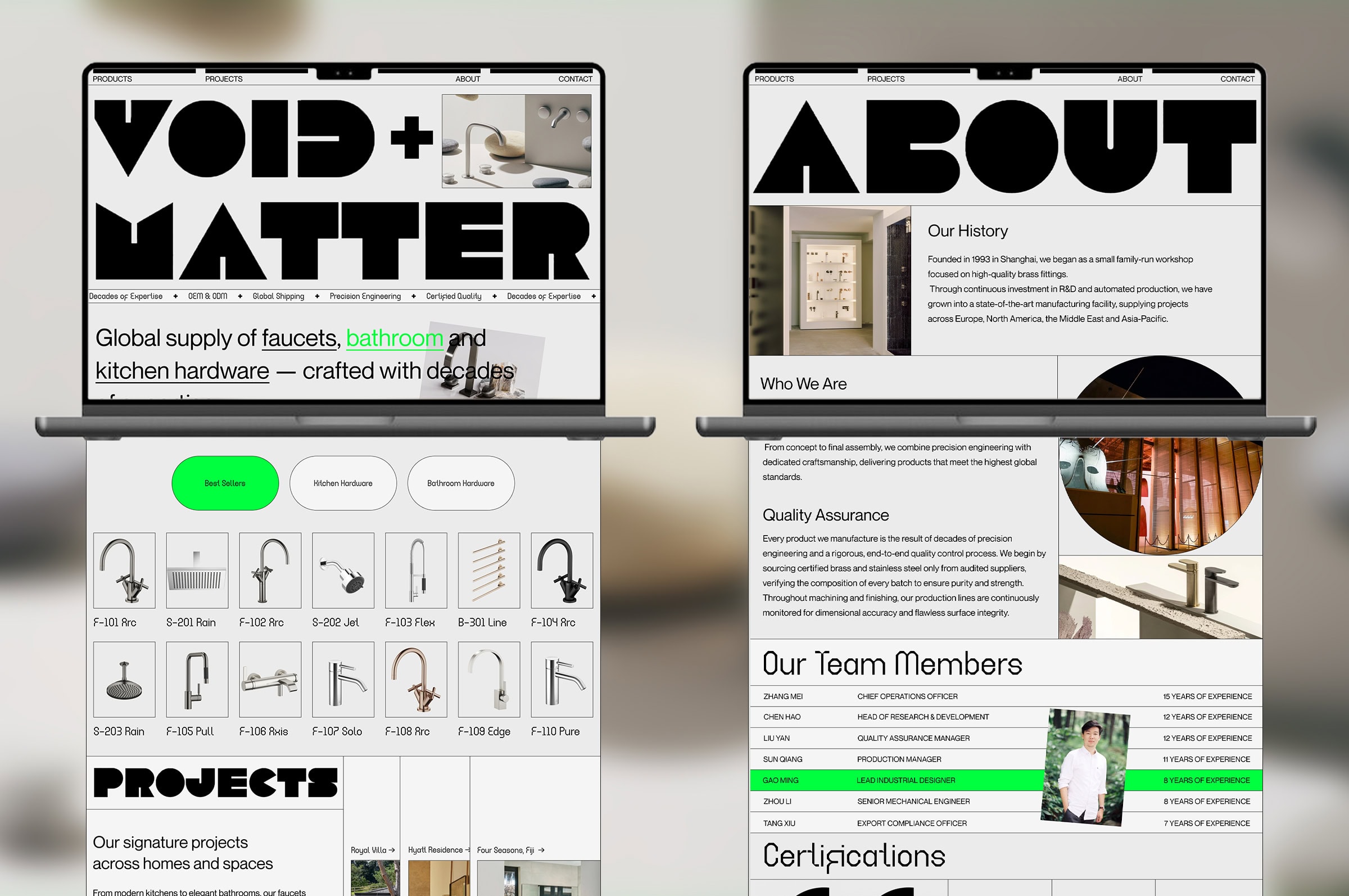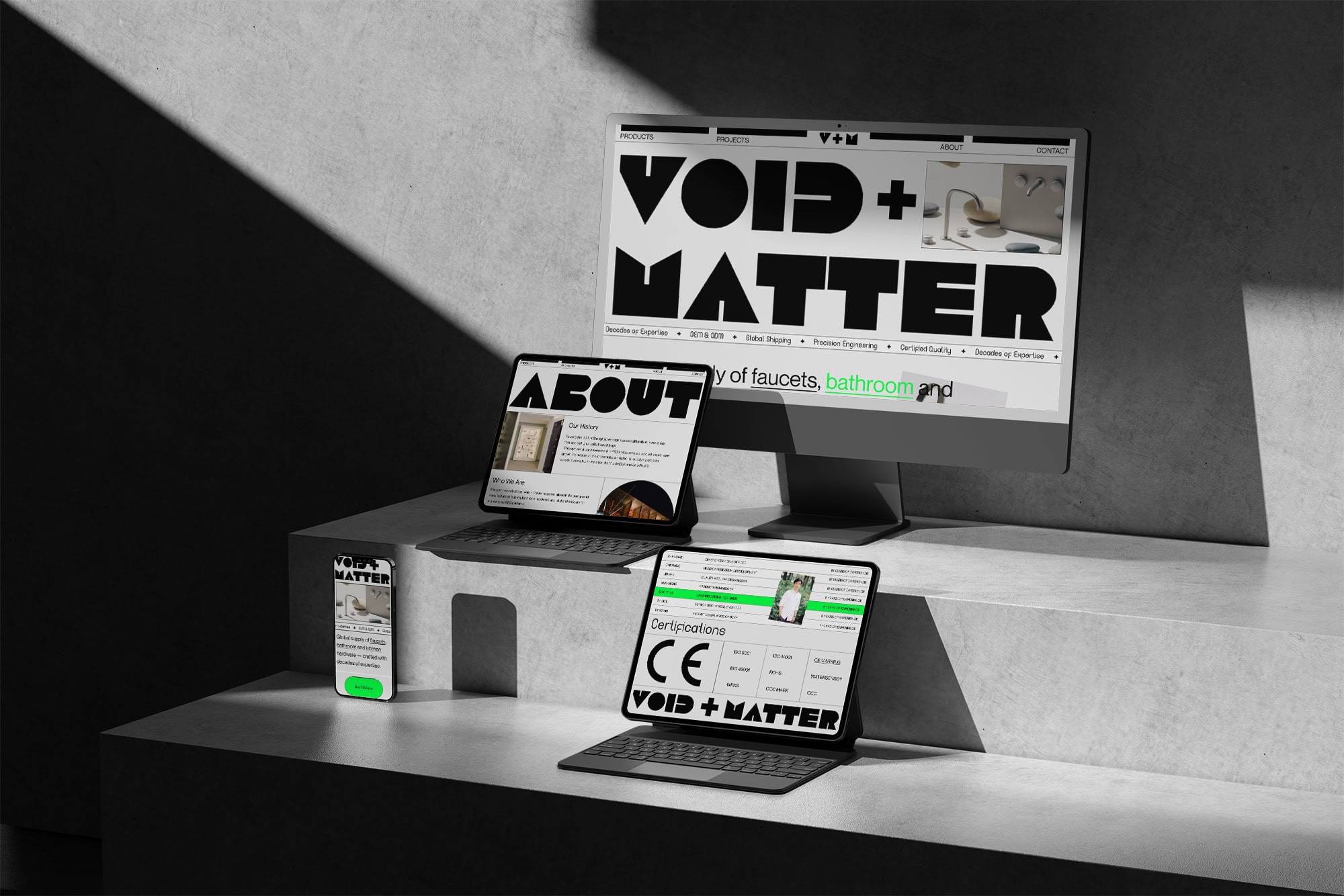 For Void + Matter, we created a website that felt more like a design studio than a factory catalog. Large typography, clean visuals, and a curated layout create an immersive, modern aesthetic that makes functional items feel iconic.